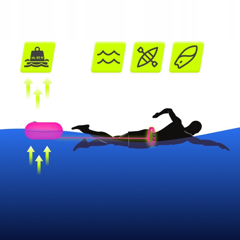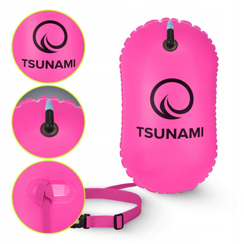 Буй Tsunami Basic виготовлений з міцного ПВХ, стійкого до механічних пошкоджень та проколів. У згорнутому стані він дуже компактний, що робить його ідеальним для транспортування в рюкзаку чи сумці. Після накачування розміри складають до 41 x 21 x 19 см, забезпечуючи високу плавучість (85 N) - цього достатньо, щоб утримати на воді дорослу людину. Буй оснащений регульованим поясним ременем для зручної фіксації на тілі та герметичним клапаном, який запобігає витоку повітря. Вага усього 162 грами робить його практично непомітним під час плавання.