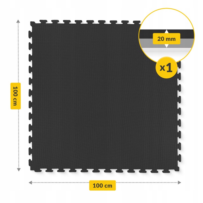 Мат 4Fizjo Mat Puzzle має розміри 100 x 100 см та товщину 2 см, що забезпечує оптимальну амортизацію й захист підлоги. Виготовлений зі щільної піни EVA (~90 кг/м³), він витримує навантаження до 100 кг на елемент і не деформується навіть при інтенсивному використанні. Текстурована поверхня запобігає ковзанню, а водостійкі властивості роблять його ідеальним для приміщень з підвищеною вологістю. Мати легко з'єднуються за допомогою пазлів-замків без використання клею, а їх модульність дозволяє створювати зони будь-якої форми. Легко миється - достатньо протерти вологою ганчіркою. Сертифікат CE підтверджує безпеку та якість матеріалів.