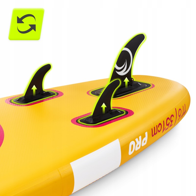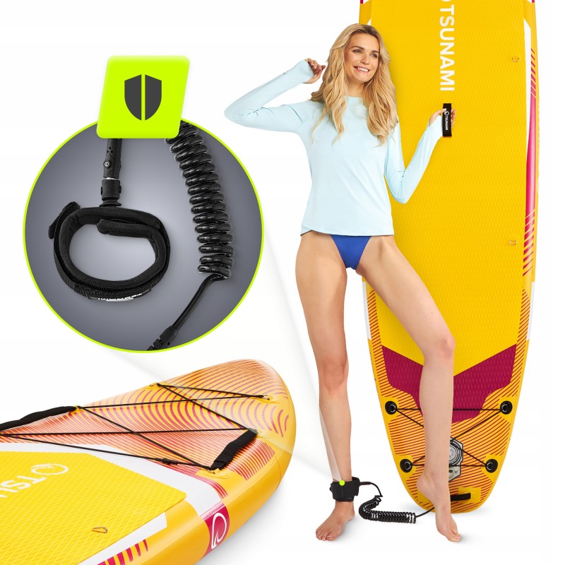 Дошка Tsunami Pro виготовлена з дотриманням сучасних стандартів: двошаровий матеріал DWF посилений тисячами волокон Dropstitch, що забезпечує максимальну жорсткість (тиск до 15 PSI) та здатність витримувати вагу до 150 кг. Її розміри у надутому стані - 350 x 86 x 15 см, у згорнутому - 90 x 18 x 37 см, що робить її компактною для зберігання та перевезення. Дошка оснащена трьома знімними плавниками для оптимальної стабілізації та покращення маневреності. Поверхня дошки встелена спеціальною підкладкою з матеріалу EVA, що має антиковзкі властивості, то ж ви з легкістю зможете обрати для себе зручне положення. На носовій та кормовій частині розташовані мотузки, які допоможуть закріпити рюкзак та інше приладдя. Регульоване подвійне весло (162-215 см) дозволяє адаптувати його під зріст користувача, а контрастні кольори дизайну підвищують видимість на воді. Додаткові аксесуари в комплекті покращують рівень безпеки та комфорту: страхувальна линва з манжетою на ногу запобігає втраті дошки, а фірмовий рюкзак ідеальний для транспортування всього вмісту.