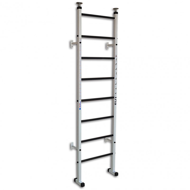 Надійна конструкція. Її деталі покриті полімерним покриттям або хромовані. Обладнана ростоміром. Є стійкою базою для навісного обладнання. Кріплення можливо c допомогою розпірних гвинтів c упором або виносними кронштейнами до стіни (4 кронштейна, 8 точок кріплення). Використання додаткового навісного обладнання дозволяє розширити функціональне використання і виконувати до 24-х силових вправ. Залежно від бажання, ви зможете оснастити свою шведську драбину навісним обладнанням Еліт