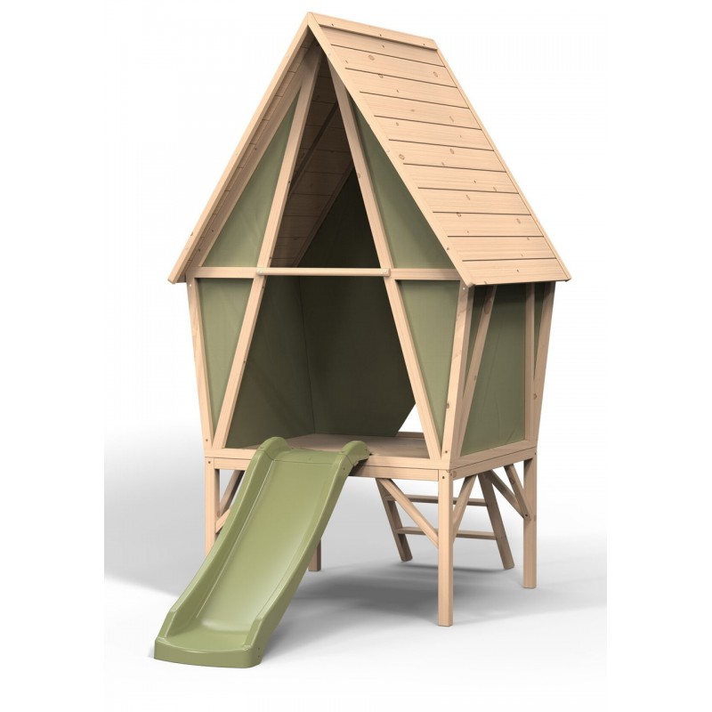 Exit Yuki 300 – це унікальне поєднання комфортного ігрового будиночка та пригодницького намету. Встановлений на палях і доповнений веселою гіркою, він стане улюбленим місцем для дитячих ігор на свіжому повітрі. Дерев'яний каркас забезпечує надійність і безпеку, а міцний зелений брезент створює атмосферу затишку та пригод.