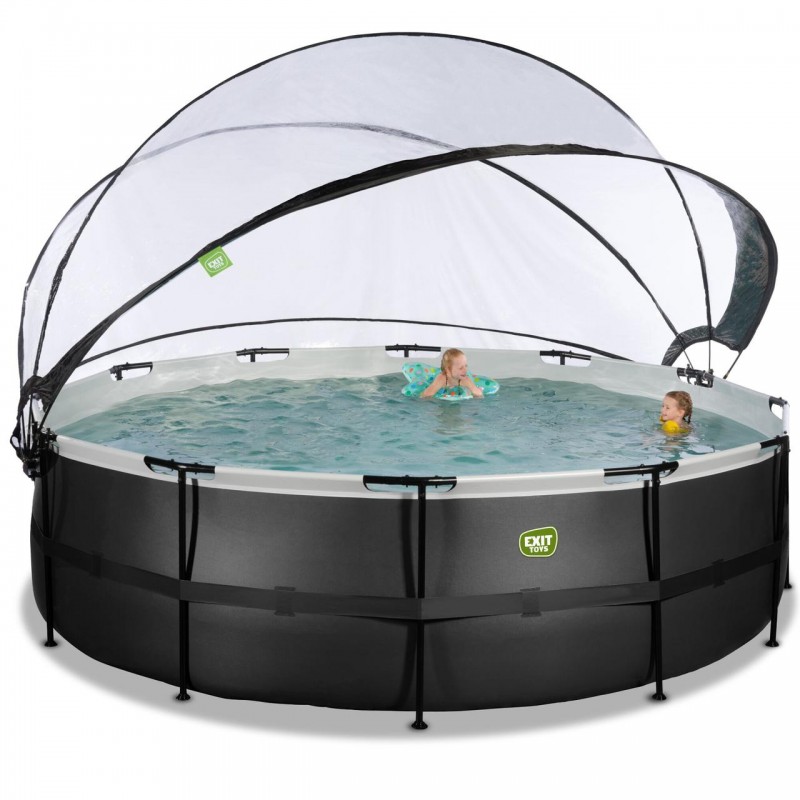Басейн з куполом Exit "чорна шкіра" 488х122 см + тепловий насос (пісочний фільтр) виглядає лаконічно і елегантно. Із зовнішнього боку - тканина із забарвленням у вигляді чорної шкіри, що зробить його розміщення в саду, на дачі або у дворі будинку особливо естетичним. У стандартну комплектацію входить насос з піщаним фільтром і сходи для басейну.
