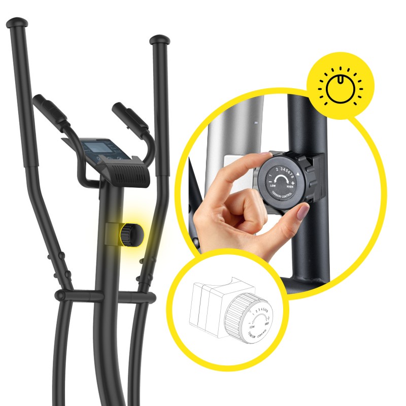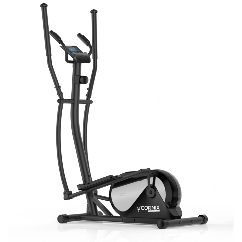 Еліптичний тренажер Cornix Mia забезпечує надійну та комфортну роботу завдяки магнітній системі опору (Magnetic Brake System), яка гарантує надзвичайно тиху роботу та плавний, безривковий хід незалежно від інтенсивності навантаження. Силу опору можна точно регулювати за допомогою 8 ручних рівнів, що дозволяє адаптувати тренування від легкого кроку до інтенсивного сходження "вгору". Стабільність руху та інерцію забезпечує збалансований маховик вагою 4 кг, а максимальне навантаження на всю конструкцію складає до 120 кг. Контрастний LCD-екран відображає ключові показники тренування: час, швидкість, дистанцію, загальний пробіг (ODO), спалені калорії та пульс (вимірюється через сенсори на рукоятках). Важливою сучасною перевагою є вбудований Bluetooth-модуль, який дозволяє синхронізувати тренажер з популярними фітнес-додатками: SPAX, Kinomap або Zwift для доступу до інтерактивних тренувань, віртуальних маршрутів та детального аналізу прогресу, перетворюючи домашні заняття на захопливий процес.