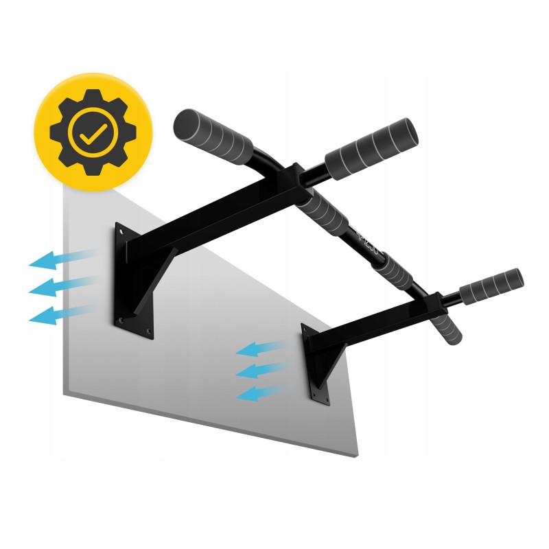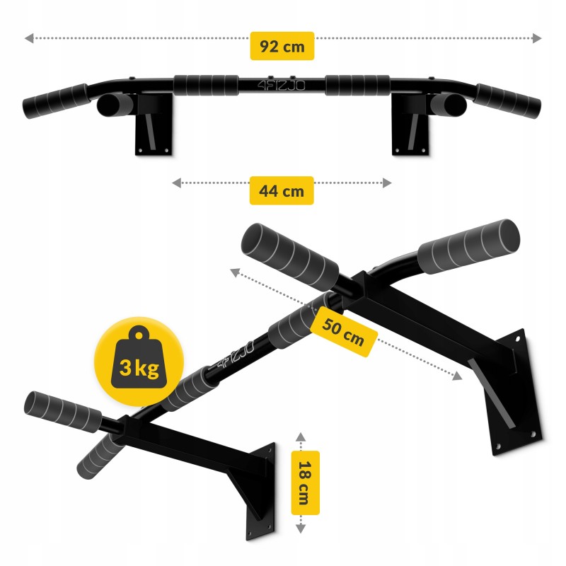 Рама тренажера від 4Fizjo виконана з високоякісного сталевого профілю, тому максимальне навантаження на неї становить до 150 кг. Виріб кріпиться до стіни на монтажні дюбелі, що йдуть у комплекті. Ручки для всіх видів хвату, якими обладнаний тренажер, дозволять проводити результативні та цікаві тренування націлені на різні групи м'язів. Нековзке покриття ручок гарантує міцний та надійний хват навіть без рукавичок. Попри те, що підтягування є основною вправою для якої призначений турнік, варіантів для тренувань значно більше. На перекладині можна ефективно тренувати м'язи преса, роблячи підйоми ніг на вису. Також верстат дає можливість використовувати різноманітні обтяження, еспандери та петлі, що дозволять корегувати ваші тренування для отримання бажаного результату.