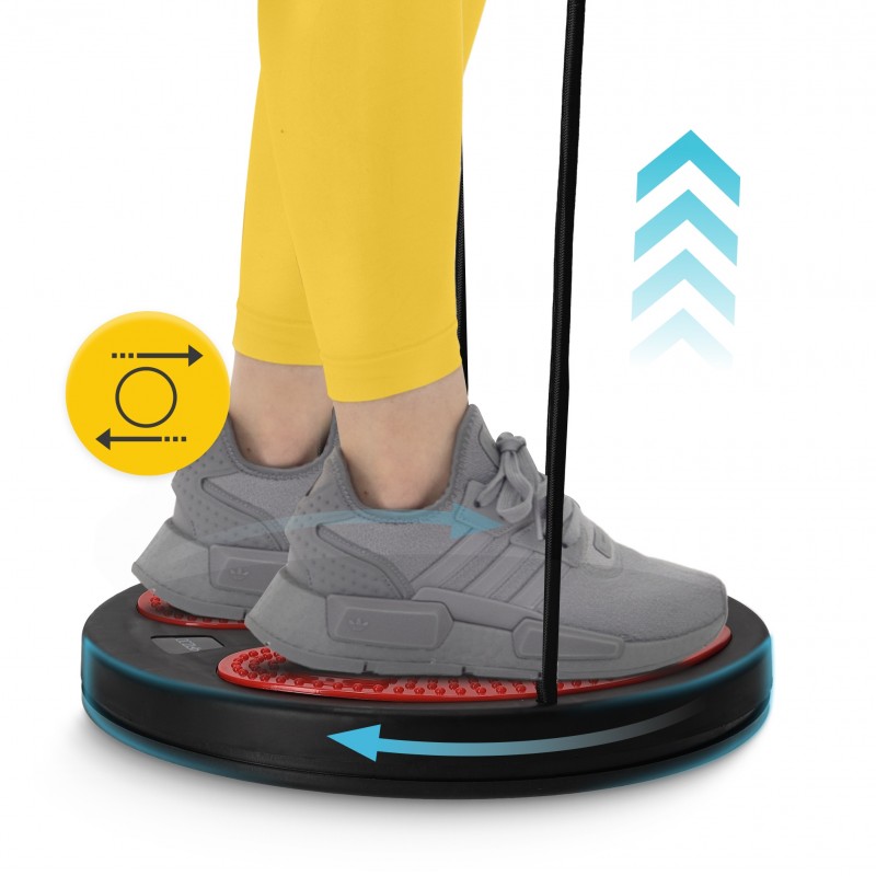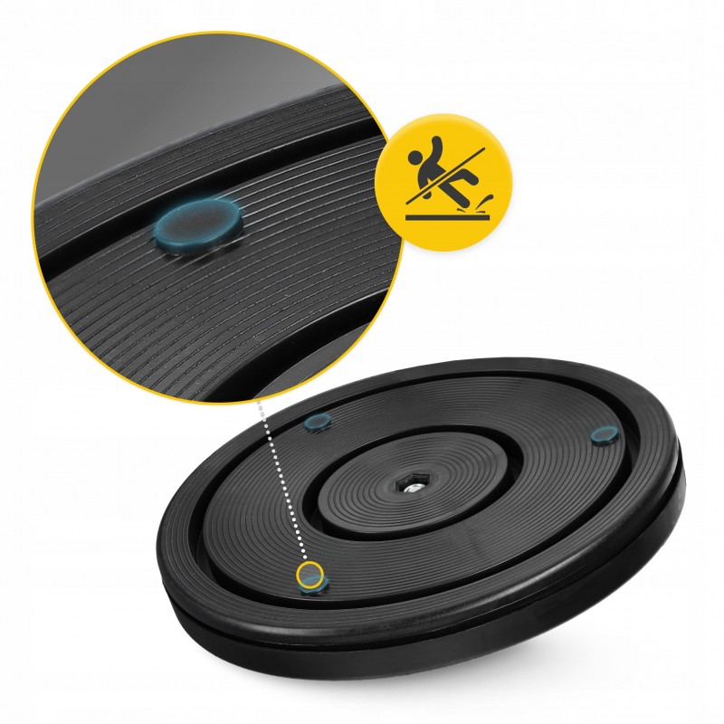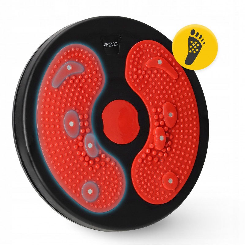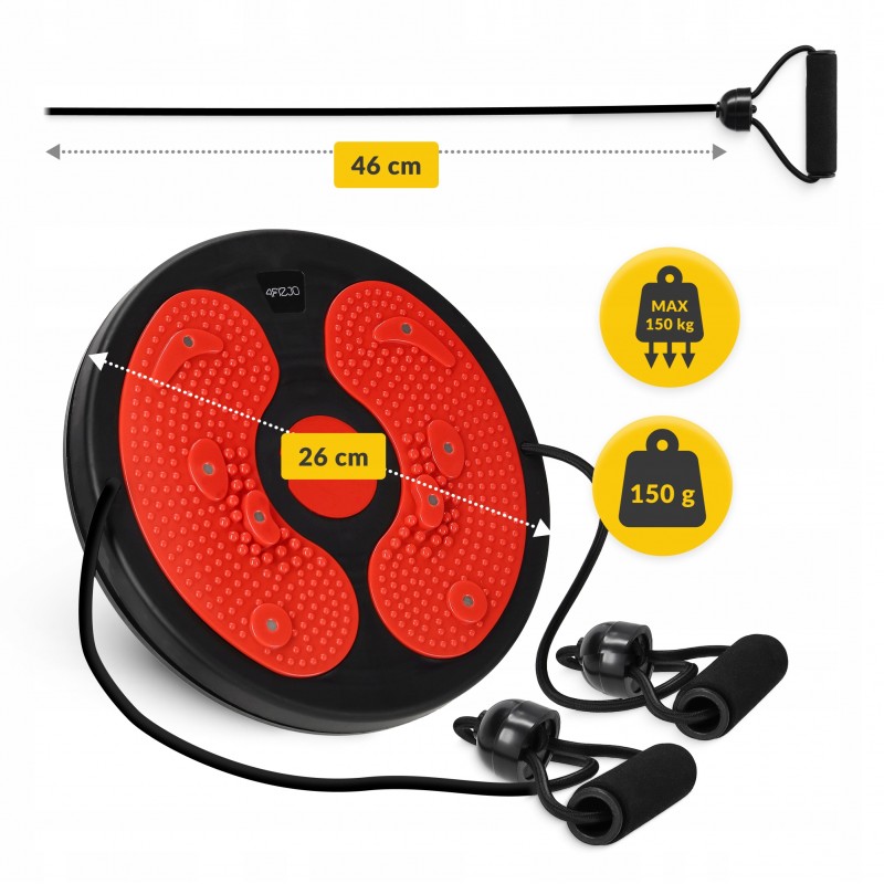 Диск здоров'я від 4Fizjo виконаний з високоякісного пластику та має продуману конструкцію з максимальним навантаженням до 110 кг. Тренажер оснащений обертовим механізмом, що сприяє плавному руху диска. Таким чином інтенсивність вправи напряму залежить від докладених зусиль користувачем. Крім того, на поверхні виробу розташовані спеціальні виступи, які виконують одразу дві функції: покращують зчеплення та забезпечують приємний сенсорний масаж стоп. На додачу, диск обладнаний двома еспандерами для рук, що дозволяють долучати м'язи верхньої частини тіла. Важливим елементом безпеки являється стійка основа з нековзкими ніжками, що гарантує стабільність інвентарю.