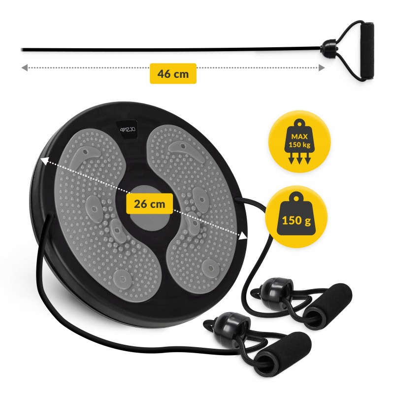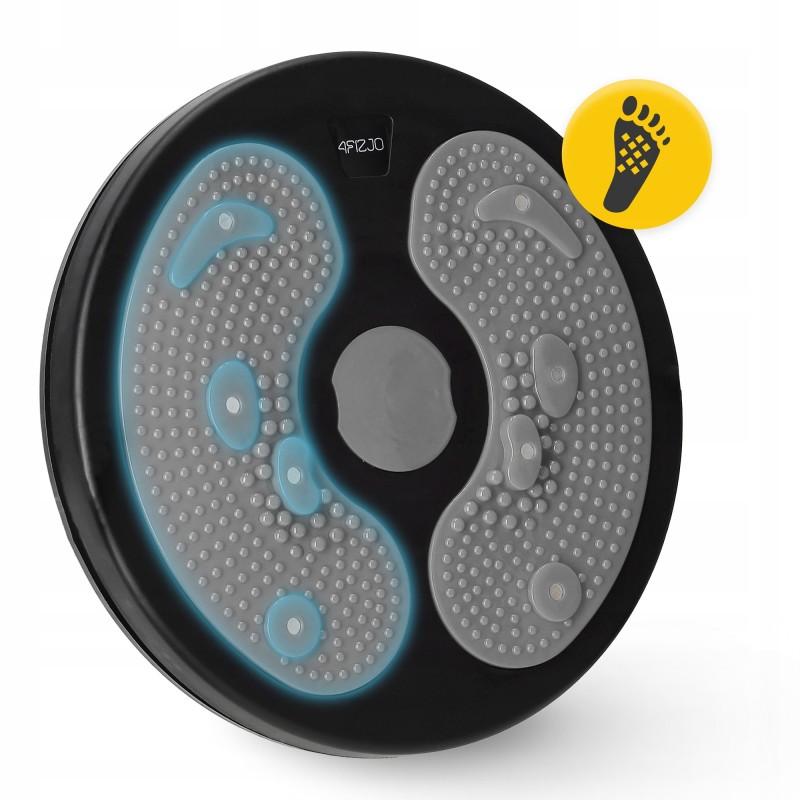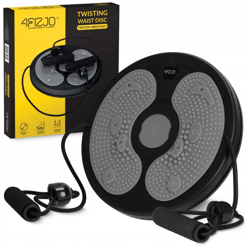 Диск здоров'я від 4Fizjo виконаний з високоякісного пластику та має продуману конструкцію з максимальним навантаженням до 110 кг. Тренажер оснащений обертовим механізмом, що сприяє плавному руху диска. Таким чином інтенсивність вправи напряму залежить від докладених зусиль користувачем. Крім того, на поверхні виробу розташовані спеціальні виступи, які виконують одразу дві функції: покращують зчеплення та забезпечують приємний сенсорний масаж стоп. На додачу, диск обладнаний двома еспандерами для рук, що дозволяють долучати м'язи верхньої частини тіла. Важливим елементом безпеки являється стійка основа з нековзкими ніжками, що гарантує стабільність інвентарю.