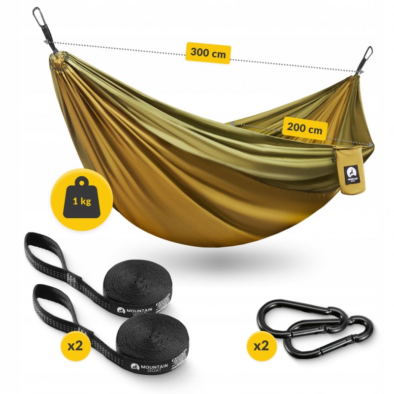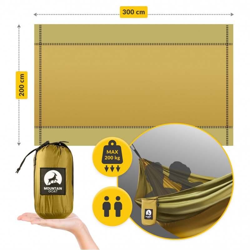 Підвісний гамак від Mountain Goat є незамінним атрибутом для любителів активного відпочинку. Розмір 300 x 200 см забезпечує достатній простір для комфортного відпочинку або сну у двох, а міцні нейлонові стропи та карабіни дозволяють швидко і надійно закріпити його між деревами чи іншими опорами. Матеріал нейлон 210Т відрізняється високою зносостійкістю, відмінно відводить вологу, "дихає", а також забезпечує приємні тактильні відчуття. У комплекті йдуть дві міцні стропи для кріплення, що дозволяють регулювати висоту гамака без додаткових інструментів. Гамак ідеально підходить для біваків, кемпінгу, походів, а також для відпочинку у саду чи на дачі.