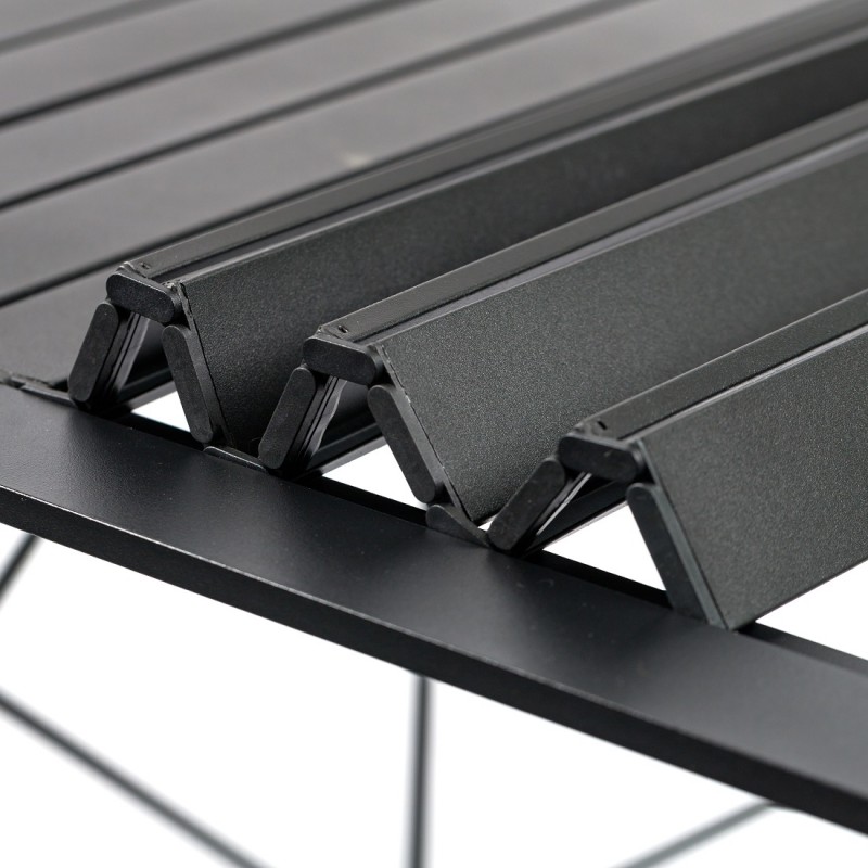 Конструкція міцна і надійна, стіл дуже стійкий, не хитається. Стільниця складається з 9 металевих ламелей, дві бічні панелі виготовлені з алюмінія щоб полегшити вагу столу.