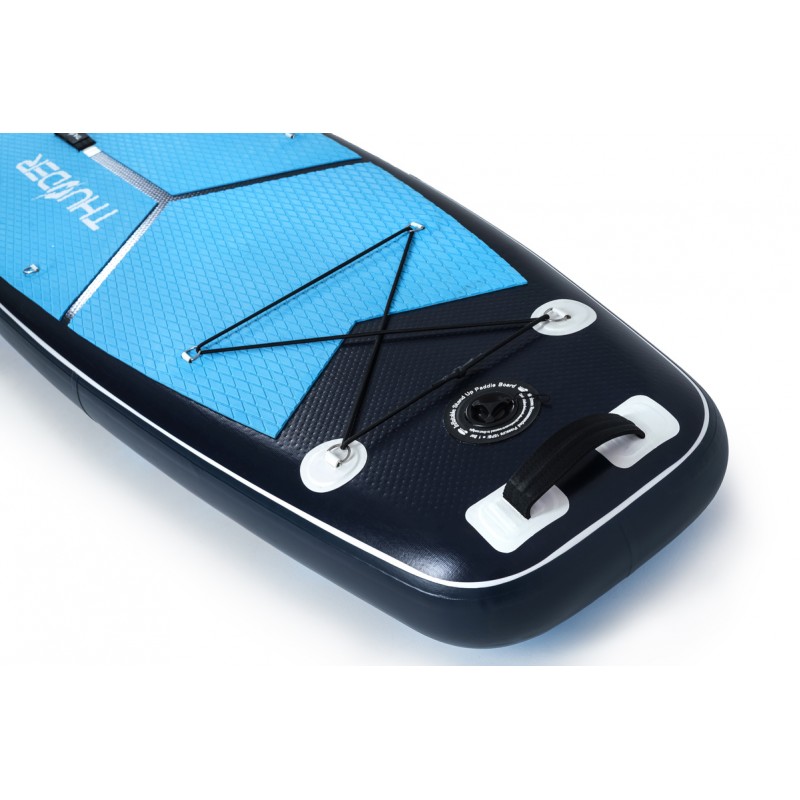 - Точка кріплення мотузки також стане в нагоді, наприклад, для прив'язування дошки до пірсу. У передній частині борту є багажна полиця, на якій ми можемо перевозити найнеобхідніші речі або прикріплювати весло під час швартування. Завдяки використаним технологіям безпеки, дошку можуть використовувати як новачки, так і досвідчені любителі спорту.