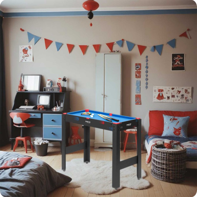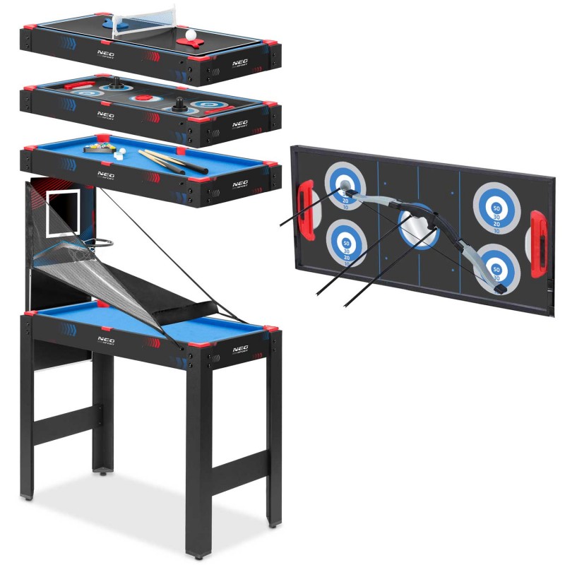 5 ігор, повний набір ігрових аксесуарів, міцні ігрові стільниці, легка збірка, миттєва зміна гри, регульовані ніжки, основа з ніжками + двостороння стільниця + більярдний стіл складається в один стіл, що економить місце. Більярдний стіл! Основа ігрового столу NS-801 - більярдний. В комплекті: трикутник, 16 куль, два киї довжиною 89 см, дві крейди.Стрільба з лука! Ігровий стіл - NS 801 - це розваги нового рівня! Крім захоплюючих поєдинків, ви можете спробувати свої сили у стрільбі по мішенях з лука та стріл. Залікова мішень додає змагальності, і гра стане чудовою розвагою як для друзів, так і для дітей!