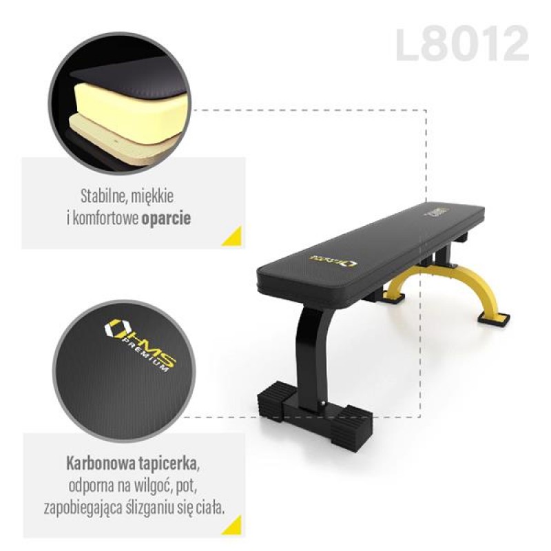 Поєднання чорного карбонового матеріалу з жовтими вишитими елементами дає чудовий візуальний ефект, характерний для бренду HMS Premium. Виняткова якість виконання та естетика лави L8012 HMS Premium роблять її ідеальним обладнанням для домашніх тренажерних залів.
