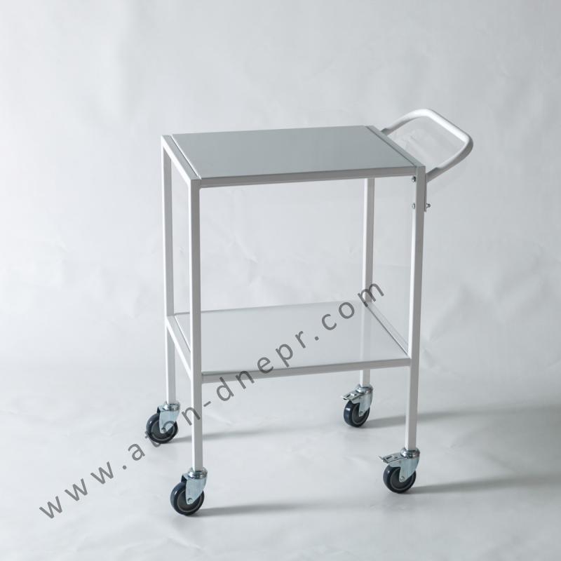 Столик медичний приладовий Атон СТ-П-2Н призначений для розміщення витратних матеріалів, медикаментів, інструментів і приладів. Столик складається з металевого каркаса з полімерним покриттям, встановленого на коліщатка з гальмами. На каркасі розташовуються дві знімні полиці, виготовлені з високоякісної полірованої нержавіючої сталі. Для зручності переміщення столик оснащений ручкою. Матеріали і комплектуючі, використовувані в конструкції, а також захисно-декоративне полімерне покриття мають необхідні висновки і допущені для використання в медичних меблях