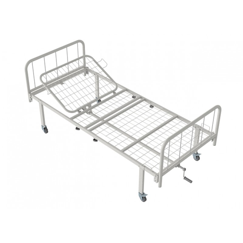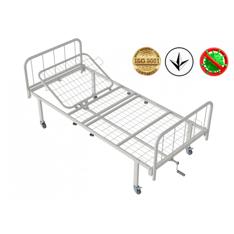 Ліжко медичне функціональне з металевими бильцями Атон КФ-2-МП-БМ-К75 і колесами діаметром ф75 мм призначена для лежачих хворих, які тимчасово обмежені в русі і потребують особливого догляду. Регулювання кута нахилу виробляється з допомогою обертання важеля регулювання. Відбувається це плавно і без зусиль, впорається навіть тендітна дівчина. При необхідності важіль регулювання можна сховати. Конструкція медичної ліжка виконана з сталевих труб, забарвлених порошковою фарбою з антибактеріальними властивостями. Каркас покритий спеціальною полімерною антибактеріальної фарбою з додаванням срібла. Це забезпечує додатковий захист від розповсюдження лікарняних інфекцій і знижує частоту санітарних обробок. Покриття стійке до дезінфекції і витримує агресивні чистячі засоби. Передбачена можливість безступінчатого регулювання кутів нахилу секцій заснування шляхом обертання відповідної ручки. Ліжко встановлена на колеса діаметром 75 мм. Можлива додаткова комплектація поперечиною, еластичним матрацом, штативом і телескопічними бічними огорожами. Переваги: перешкоджає поширенню внутрішньолікарняних інфекцій; легка збірка; три модифікації билец; фіксатор матраца; колеса з фіксатором; посилений каркас; можлива комплектація бічними огорожами та/або штативом, та/або медичним матрацом; гарантія 18 місяців. Характеристики розмір: 2050х900х880 мм; каркас: сталь з антибактеріальним порошковим покриттям; навантаження: до 180 кг. Термін служби (не менше) - 5 років.