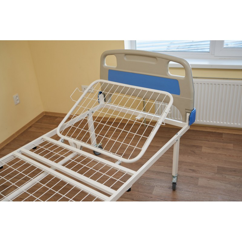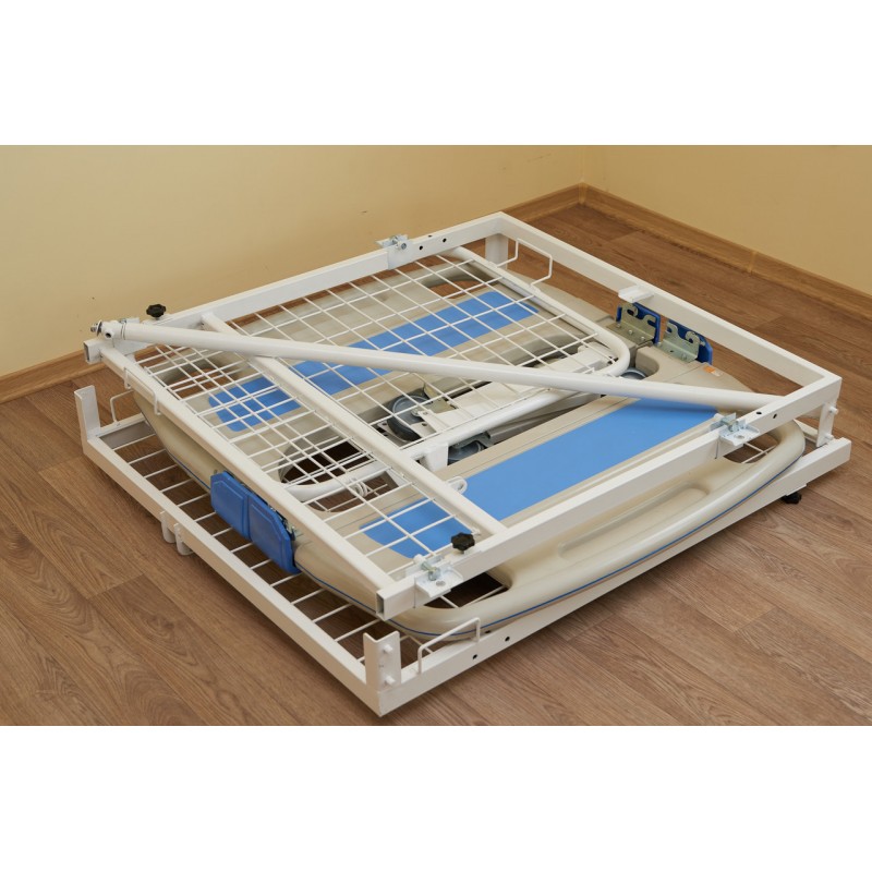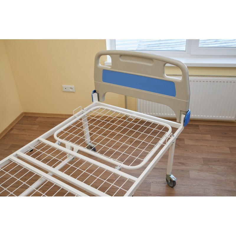 Ліжко з електроприводом чотирьохсекційне медичне функціональне Атон КФ-4-ЕП-БП-К125 з пластиковими бильцями та колесами ф125 мм призначене для лежачих хворих, які тимчасово обмежені в русі та потребують особливого догляду. Регулювання кута нахилу провадиться за допомогою електроприводу з керуванням від пульта. Конструкція медичного ліжка виготовлена із сталевих труб, пофарбованих порошковою фарбою з антибактеріальними властивостями. Каркас покритий спеціальною полімерною антибактеріальною фарбою із додаванням срібла. Це забезпечує додатковий захист від поширення лікарняних інфекцій та знижує частоту санітарних обробок. Покриття стійке до дезінфекції і витримує агресивні засоби для чищення. Кут підйому головної секції від 0˚ до 70˚, кут підйому ножної секції - від 0˚ до 45˚. Ліжко встановлене на колеса діаметром 125 мм. Можлива додаткова комплектація поперечиною, еластичним матрацом, штативом та телескопічними бічними огорожами. Переваги: перешкоджає поширенню внутрішньолікарняних інфекцій; легке складання; електричний привід; три модифікації бувець; фіксатор матраца; колеса із фіксатором; посилений каркас; можлива комплектація бічними огорожами та/або штативом, та/або медичним матрацом; гарантія 18 місяців. Характеристики розмір: 2050х900х880 мм; каркас: сталь із антибактеріальним порошковим покриттям; навантаження: до 180 кг. Термін служби (не менше) – 5 років.