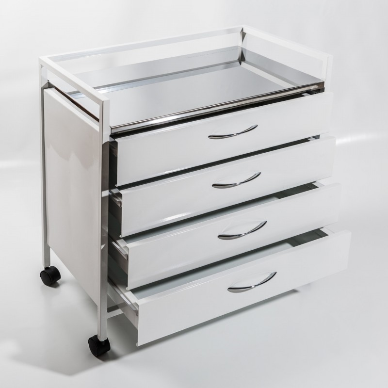 Столик-тумба медична Атон СТ-Т-Н призначений для розміщення витратних матеріалів, медикаментів та інструментів. Столик медичний виконаний у вигляді металевого каркаса з полімерним покриттям, встановленого на коліщата з гальмами. В каркасі розташовуються 4 ящики. Над шухлядами розташована полиця з високоякісної полірованої нержавіючої сталі. З трьох сторін полку має огорожу, одночасно виконує функцію ручок для переміщення столика. Матеріал каркаса сталь з полімерним покритямм Матеріал полиці нержавіюча сталь Габаритні розміри, мм 720х450х798 Допустиме навантаження на полицю, кг 10 Допустиме навантаження на шухдяду, кг 5 Кількість шухляд, шт 4 Гарантийний термін експлуатації, міс 18 Термін служби (не меньше), міс 60 Маса вироба, кг 29