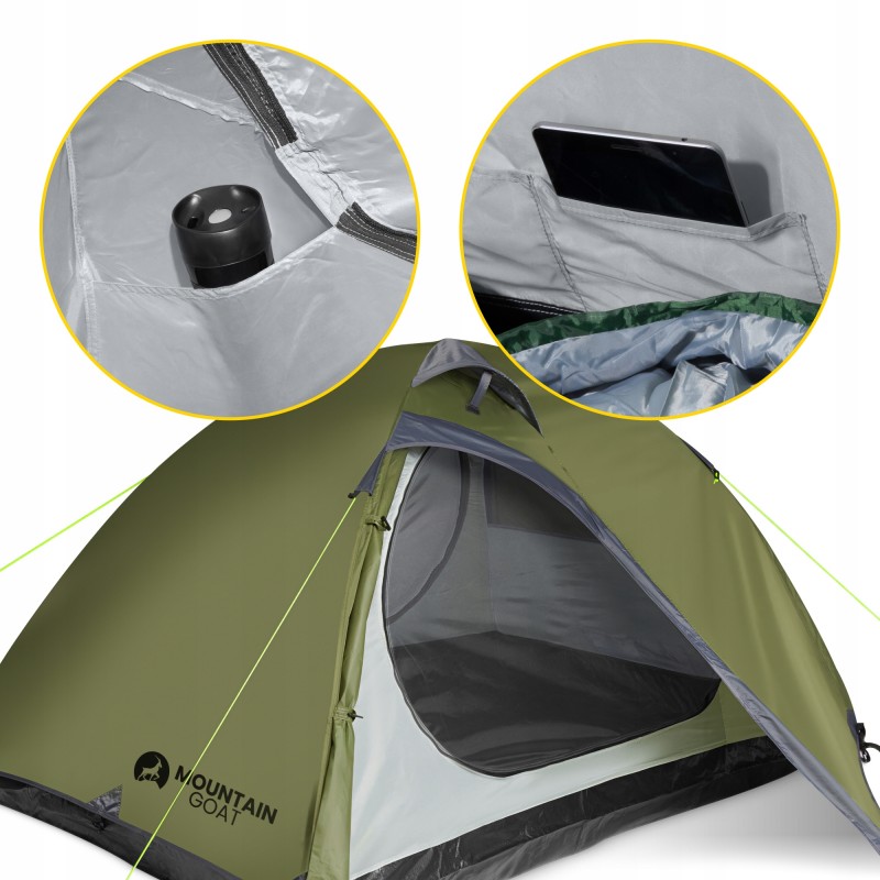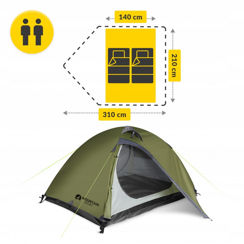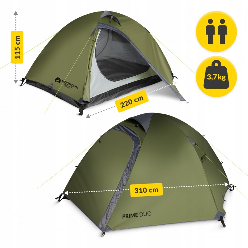 Конструкція намету Mountain Goat Prime Duo заснована на класичній купольній формі з двома перехресними дугами зі скловолокна діаметром 9.4 мм - це забезпечує високу стійкість навіть під час вітру. Верхній тент виготовлений із поліестеру 70D/190T з поліуретановим покриттям і водостійкістю до 4000 мм водяного стовпа. Підлога з міцного поліетилену витримує до 6000 мм води, а герметичні шви додатково захищають від протікань. Усередині розташована простора спальня розміром 210 x 140 x 115 см, а загальні габарити намету - 220 x 310 x 115 см. Передбачено два тамбури довжиною по 80 см кожен - ідеальні для зберігання спорядження чи взуття. Для зручності у користуванні є москітні сітки, внутрішні кишені та петля для ліхтарика. Усе це пакується в компактний чохол розміром 54 x 15 см, загальна вага - 3.7 кг.