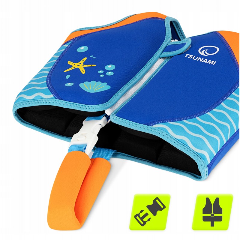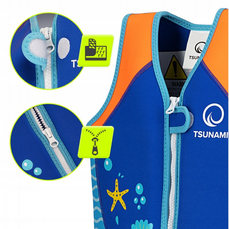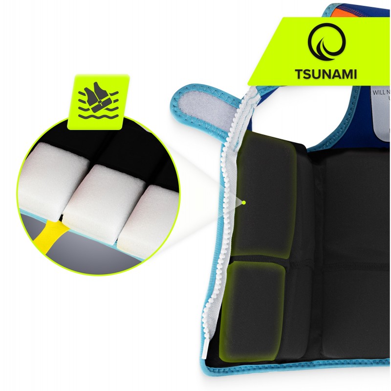 Жилет Tsunami виготовлено з міцного і гнучкого матеріалу: зовнішній шар - це поєднання 80% неопрену та 12% поліестеру, що не подразнює шкіру та швидко висихає. Внутрішня підкладка на 100% з поліестеру забезпечує додатковий комфорт, а наповнювач із поліетиленової піни гарантує позитивну плавучість. Конструкція жилета дозволяє регулювати рівень занурення завдяки знімним вставкам, які легко виймаються. Модель має зручну застібку на блискавку, додатково закріплену липучкою, що не дозволяє дитині самостійно її розстебнути. Габарити становлять 30 x 29 см, а рекомендована вага дитини - від 15 до 19 кг. Виріб відповідає стандарту безпеки EN13138-1:2021 і має сертифікат CE, що підтверджує його відповідність європейським нормам.