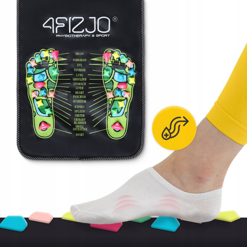 Килимок ортопедичний з каменями для масажу ніг від польського бренду 4Fizjo - це ефективний інструмент для рефлексотерапії, створений для підтримки здоров'я, покращення самопочуття та зняття втоми після тривалого дня. Стимулюючи біологічно активні точки на стопах, він сприяє нормалізації роботи внутрішніх органів, активізує кровообіг та допомагає зменшити м'язову напругу. Завдяки імітації ходьби босоніж по гальці та нерівній поверхні, масаж стає не лише корисним, а й приємним. Використання килимка - це простий спосіб відновити енергію, знизити стрес та підтримувати загальний тонус організму, не виходячи з дому.