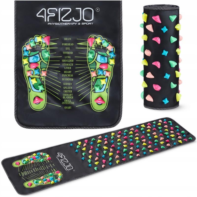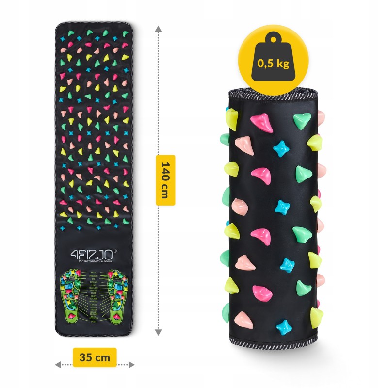 Килимок від 4Fizjo має розміри 140 x 35 см і виготовлений з міцного та зносостійкого поліпропілену (PP) і ABS, що гарантує тривалий термін служби. Поверхня оснащена багатобарвними камінчиками, розташованими у двох зонах з різною щільністю та формою, для цілеспрямованої стимуляції стоп. На початку килимка розміщена схема з позначенням ключових акупунктурних точок, що дозволяє проводити точковий масаж із користю для конкретних систем організму. Легка вага (близько 0.5 кг) та гнучка конструкція дають змогу швидко згорнути виріб і взяти його з собою в подорож, на роботу або до зали для реабілітації. Килимок легко чиститься - достатньо протерти його вологою ганчіркою. У комплект входять 3 запасні масажні камінці.