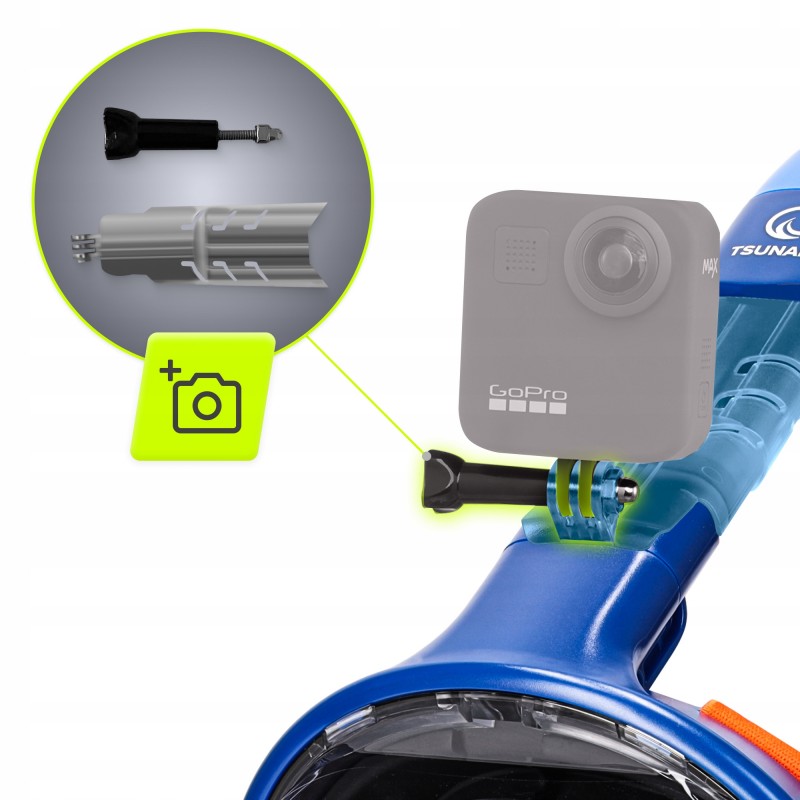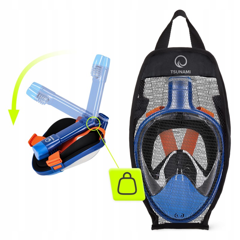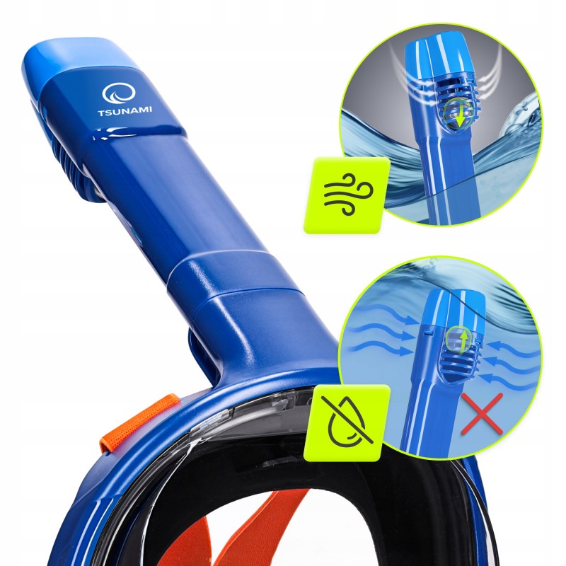 Маска Tsunami поєднує в собі вдосконалену функціональність з продуманою ергономікою. Обтюратор виготовлений з приємного на дотик та гіпоалергенного силікону, тому ідеально припасовується до обличчя. Складна дихальна трубка дозволяє компактно зберігати виріб у сітчастій сумці, що йде у комплекті. Система Dry Top оснащена плаваючим кульковим клапаном, який миттєво перекриває доступ води при зануренні, усуваючи ризик захлинання. Регульовані ремені забезпечують індивідуальне прилягання до голови користувача, а вбудоване кріплення для GoPro дає змогу фіксувати підводні дослідження від першого лиця. Вага маски - лише 480 г, що зменшує навантаження на шию під час тривалих запливів.
