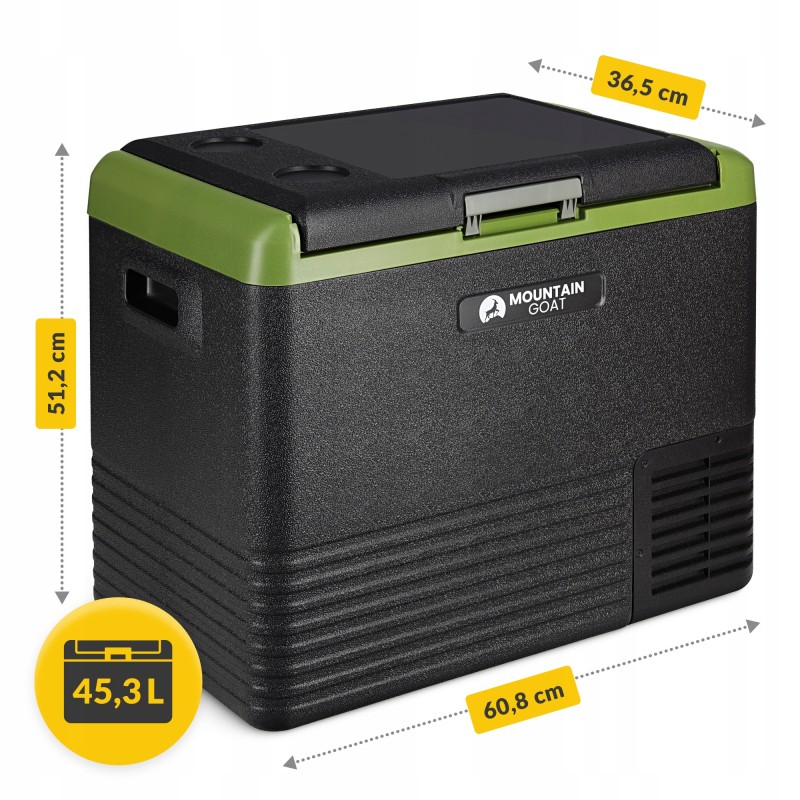 Холодильник Mountain Goat Liberty обладнаний потужною компресорною системою (не плутати з менш ефективними термоелектричними моделями), що забезпечує швидке охолодження та стабільний температурний режим навіть у спекотні дні. Його об'єм 45.3 л умістить провізію для сім'ї чи навіть компанії друзів, а герметичний внутрішній бак запобігає витокам рідини. Апарат живиться від автомобільного прикурювача (12/24 В) або звичайної розетки (100-240 В), споживаючи лише 45-60 Вт енергії. Цифровий дисплей дозволяє точно налаштувати температуру, а рівень шуму менше 45 дБ (як тиха розмова) не заважатиме відпочинку. Габарити (60.8 x 36.5 x 51.2 см) та вага (13.4 кг) оптимізовані для транспортування, а в комплекті йдуть обидва кабелі живлення.