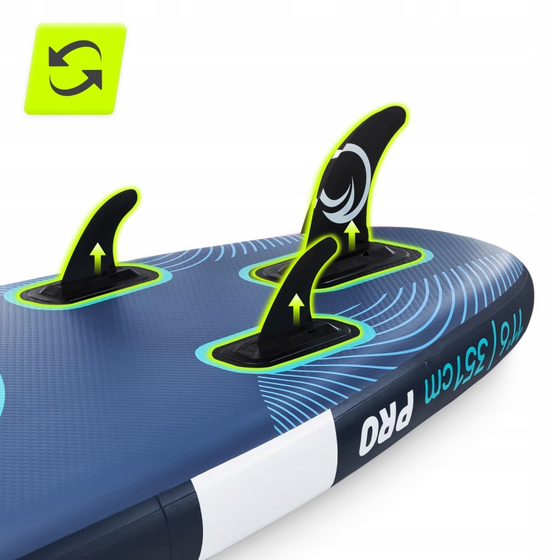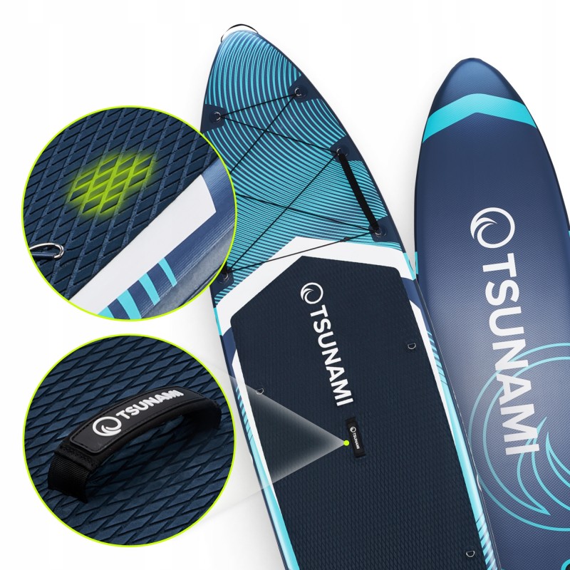 Дошка Tsunami PRO виготовлена з дотриманням сучасних стандартів: двошаровий матеріал DWF посилений тисячами волокон Dropstitch, що забезпечує максимальну жорсткість (тиск до 15 PSI) та здатність витримувати вагу до 150 кг. Її розміри у надутому стані - 350 x 86 x 15 см, у згорнутому - 90 x 18 x 37 см, що робить її компактною для зберігання та перевезення. Дошка оснащена трьома знімними плавниками для оптимальної стабілізації та покращення маневреності. Поверхня дошки встелена спеціальною підкладкою з матеріалу EVA, що має антиковзкі властивості, то ж ви з легкістю зможете обрати для себе зручне положення. На носовій та кормовій частині розташовані мотузки, які допоможуть закріпити рюкзак та інше приладдя. Регульоване подвійне весло (162-215 см) дозволяє адаптувати його під зріст користувача, а контрастні кольори дизайну підвищують видимість на воді. Додаткові аксесуари в комплекті покращують рівень безпеки та комфорту: страхувальна линва з манжетою на ногу запобігає втраті дошки, а фірмовий рюкзак ідеальний для транспортування всього вмісту.