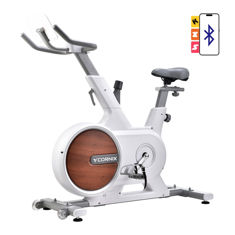 Серце спінінгового велотренажера Cornix Eliza - це моторизована магнітна система (Motorized Magnetic Brake System) з 32 автоматичними рівнями опору, що миттєво змінюються за допомогою електронного регулятора. Аутентичний досвід забезпечують потужний 6 кг маховик з максимально тихою та плавною роботою, ергономічне сидіння та кермо з можливістю регулювання позиції, що імітує аеродинамічну посадку шосейника, а також спортивні педалі з фіксацією. Конструкція витримує до 140 кг ваги (власна маса 31 кг), гарантуючи стабільність навіть під час спринтів. Контрастний LCD-дисплей відображає час, швидкість, дистанцію, ODO, калорії та RPM, а вбудований Bluetooth-модуль синхронізується з додатками SPAX, Kinomap, Zwift для групових віртуальних заїздів, персональних програм та детального аналізу продуктивності.