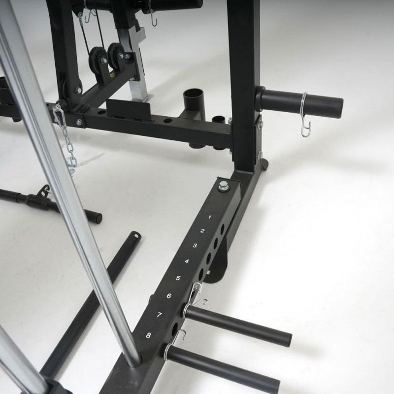 Машина Сміта: вбудований напрямний гриф довжиною 174,3 см із системою фіксації на 16 рівнях висоти (45,5–180,5 см) — безпечне виконання жиму, присідань і тяг без напарника.