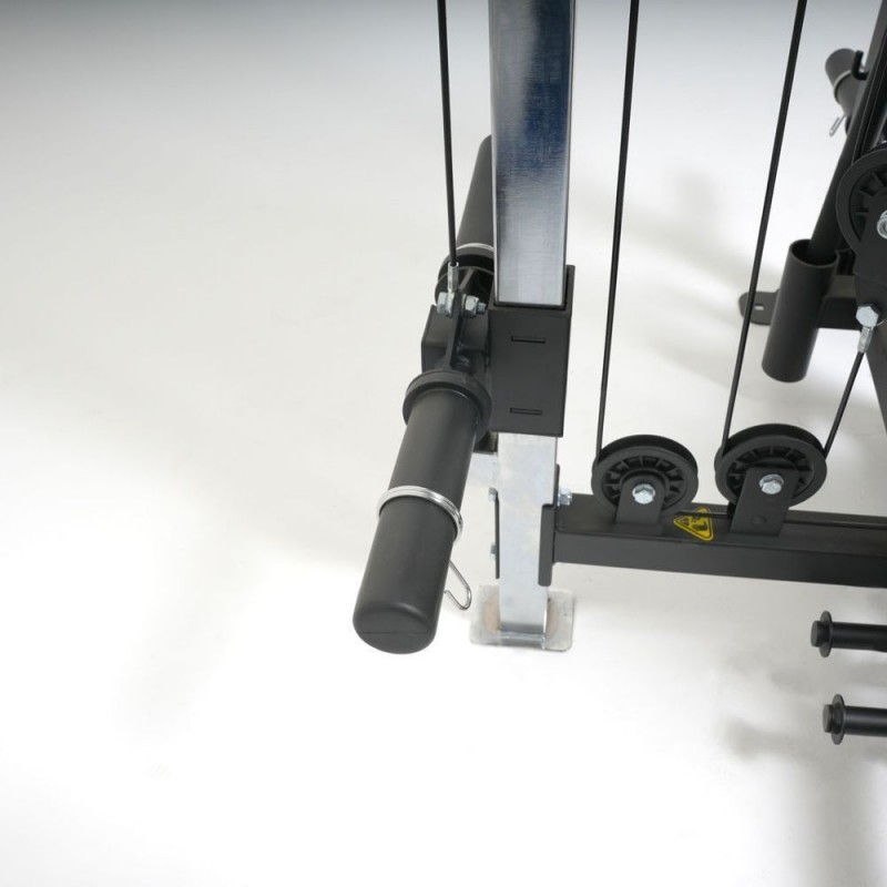 Аксесуари в комплекті: 2 J-подібні тримачі, 2 страхувальні упори з валиками для ніг, турнік для підтягувань, паралельні бруси для віджимань, тримач для грифа, 8 тримачів для дисків діаметром 5 см і 2,5 см, 12 пружинних замків діаметром 4,9 см, 4 пружинних замків діаметром 4,7 см, ремінь, адаптер landmine, 2 регульовані Y-ручки, вигнутий гриф, пряма тяга, ланцюг, канат, манжета на щиколотку.