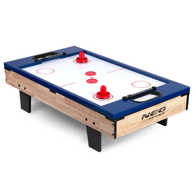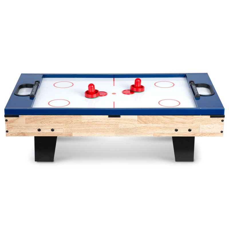 Стіл для аерохокею! Міні-версія цієї культової гри для вашого дому. В комплекті: ігрова ручка для кожного гравця, дві зелені основи для ручки, дві шайби, кілочки для кріплення дошки, стійка з кожного боку.