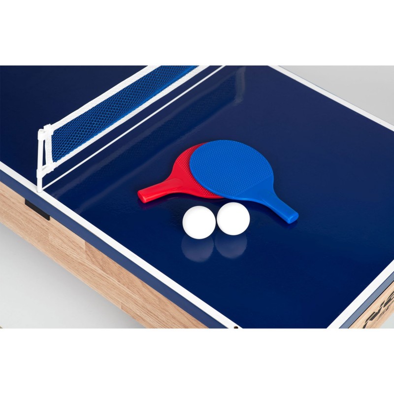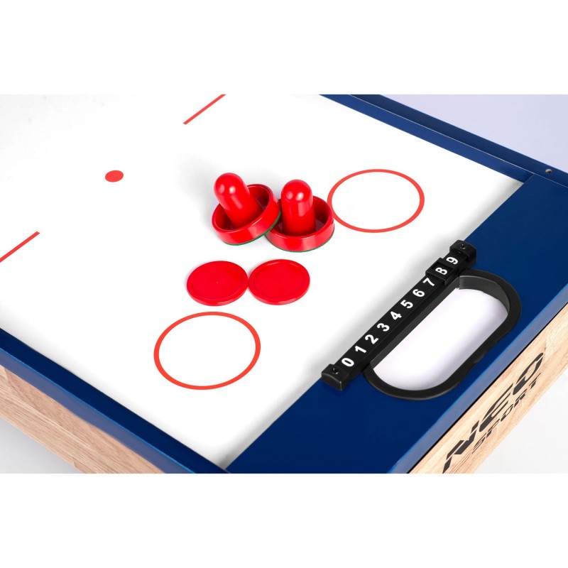 Основні характеристики: міцні пластикові фігурки для гри в настільний футбол, 7 гравців у команді (1, 3, 3 вирівнювання), гумові заглушки на гравцях і рейках, зручні лічильники воріт, синій борт для хокею і пінг-понгу, більярдний стіл, необхідні аксесуари для гри, Foosball Neosport!
