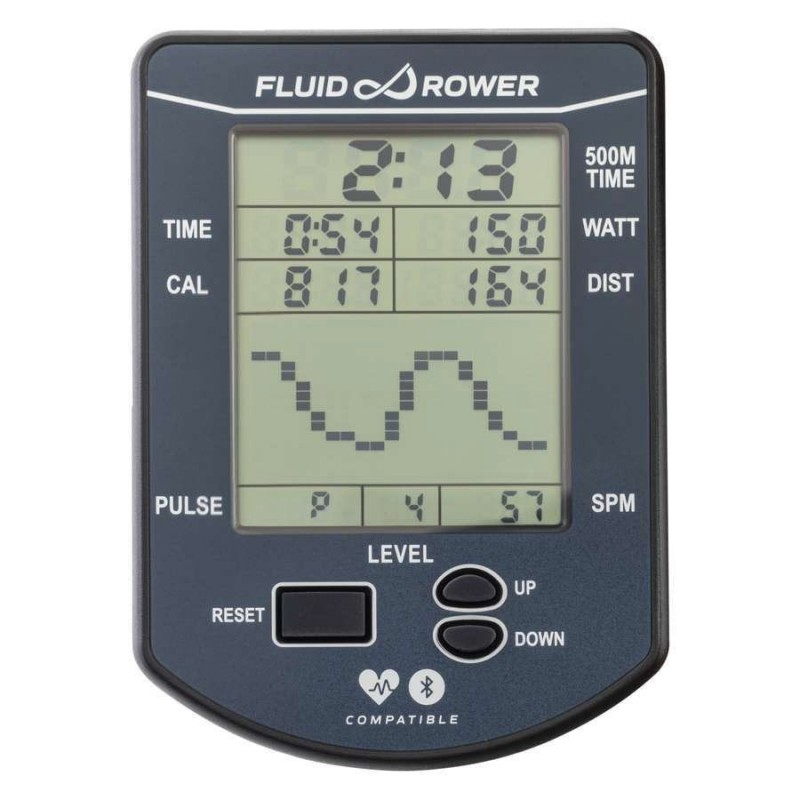 Монітор Fluid Bluetooth надає миттєву інформацію про всі параметри вашого тренування, такі як час, вати, калорії, дистанція та кількість гребків веслування за хвилину. Крім того, монітор автоматично відображає рівень опору, який ви встановили за допомогою циферблата на веслувальному тренажері. Ви також можете підключитися до тренувальних програм, таких як Fluid Connect, Regatta, Asensei, EXR та Kinomap, за допомогою Bluetooth.