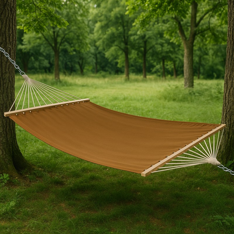 Цей великий гамак створений для тих, хто любить природну гармонію й затишок. М’який відтінок camel — як пісок на узбережжі чи тепле сонце на заході. Він легко вписується в будь-який простір: біля дерев, на терасі, під перголою чи просто на балконі.