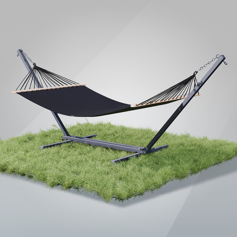 Сталевий каркас для гамака виготовлений з металевого профілю 50х50, що робить його зовнішній вигляд масивнішими, а конструкцію міцною та стійкою. Також стійка для гамака комплектується всіма потрібними елементами для кріплення гамака (гаки м12, карабіни М10 та ланцюги )