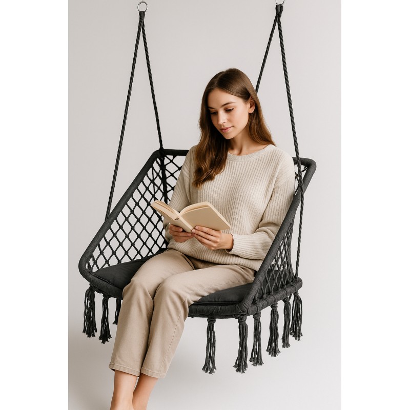 Оновлений погляд на комфорт і стиль! Підвісне крісло-гойдалка WCG з прямокутним сидінням — це нова генерація гамака для дому, балкона або тераси. Модель поєднує в собі зручну посадку, оновлений дизайн і витончений стиль boho, що додає простору затишку та індивідуальності.