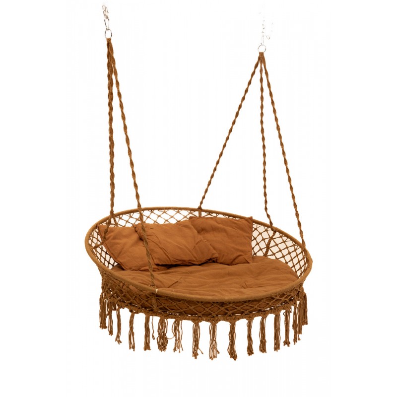 Витримане в стилі бохо, це підвісне крісло прикрасить терасу, спальню, балкон чи сад. Завдяки декоративній бахромі, м’яким подушкам і стильному плетінню, гойдалка виглядає затишно та естетично в будь-якому просторі — як у приміщенні, так і на вулиці.