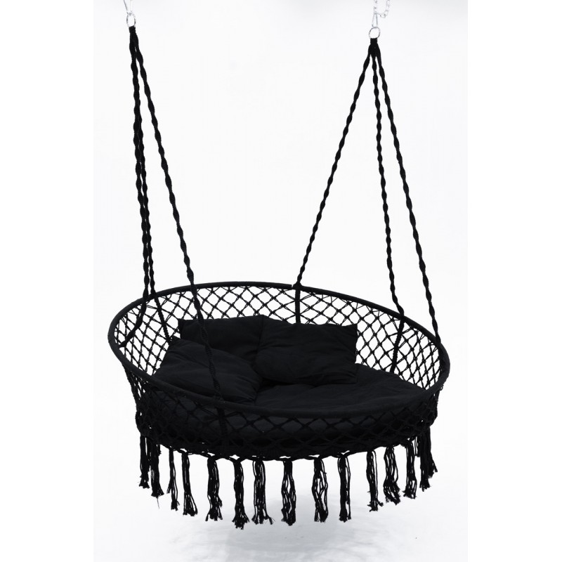 Витримане в стилі бохо, це підвісне крісло прикрасить терасу, спальню, балкон чи сад. Завдяки декоративній бахромі, м’яким подушкам і стильному плетінню, гойдалка виглядає затишно та естетично в будь-якому просторі — як у приміщенні, так і на вулиці.