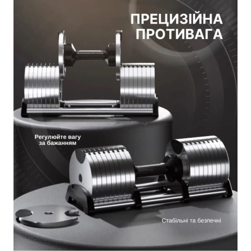 - Одна гантеля замінює 6–12 пар класичних гантель.