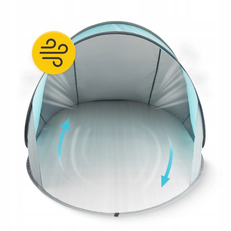 Конструкція намету 4Fizjo Pop-Up поєднує в собі практичність і надійність. Купол виготовлений зі 100% поліестеру, що не вбирає вологу й швидко сохне, а зовнішнє покриття з фільтром UV 30+ ефективно захищає від ультрафіолету, створюючи затінок всередині. Гнучкий каркас зі скловолокна забезпечує стійкість навіть на м'яких поверхнях. Розміри у розкладеному вигляді: 195 x 120 x 85 см - дозволяють комфортно розміститися одному-двом дорослим або дорослому з дитиною. У складеному стані діаметр намету становить лише 62.5 см, товщина - 2.5 см, а вага - близько 1 кг. У комплекті передбачено чотири кілочки для фіксації, сумку для зберігання та чохол для аксесуарів - усе для максимальної зручності під час транспортування.