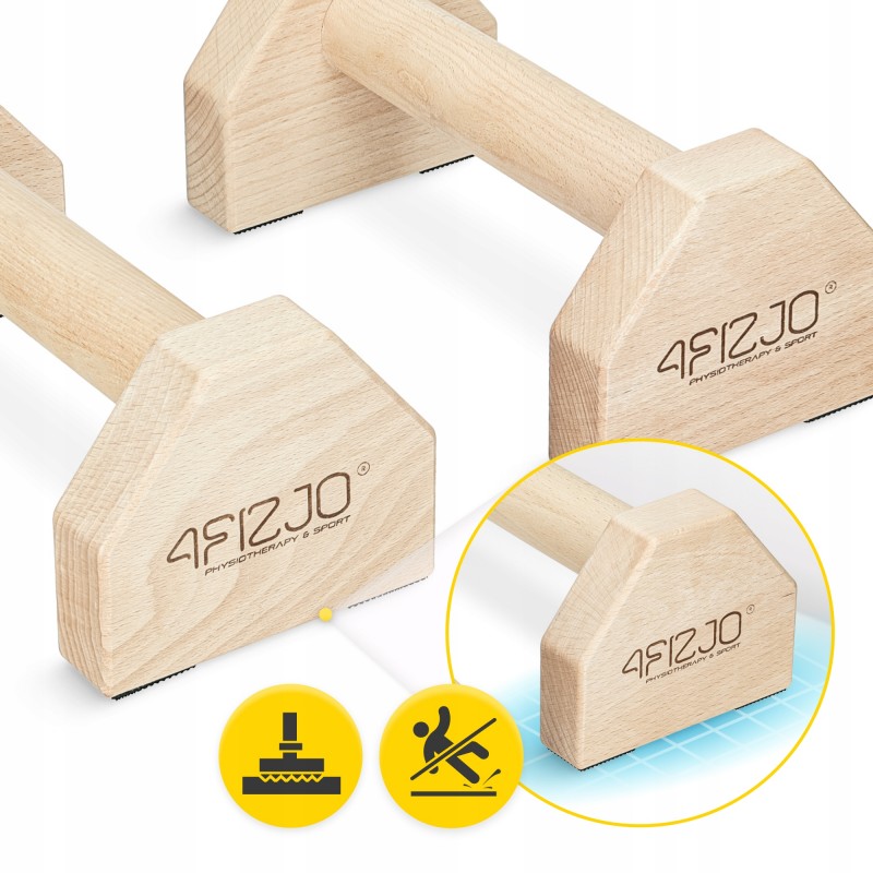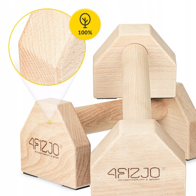 Дерев'яні упори для віджимань (паралетси) польського бренду 4Fizjo - це простий та ефективний спортивний аксесуар, який допоможе урізноманітнити тренувальний процес і зробити заняття більш безпечними та результативними. Вони підходять для тренувань у залі й удома, незалежно від рівня підготовки. Використання паралетсів дозволяє виконувати класичні віджимання з правильним положенням кистей, знижуючи навантаження на суглоби та запобігаючи травмам. Крім того, завдяки піднесенню корпусу над підлогою, рухи стають глибшими, що дає змогу активувати більше м'язових груп і підвищує ефективність рухів. Ці упори допомагають не лише у віджиманнях - на них можна тренувати баланс, виконувати планку, L-sit чи стійку на руках, що робить їх корисним інструментом для всіх, хто займається силовими вправами, калистенікою або просто хоче покращити фізичну форму. Вони будуть однаково корисні для спортсменів і аматорів, які прагнуть посилити свої результати та зробити заняття різноманітнішими.