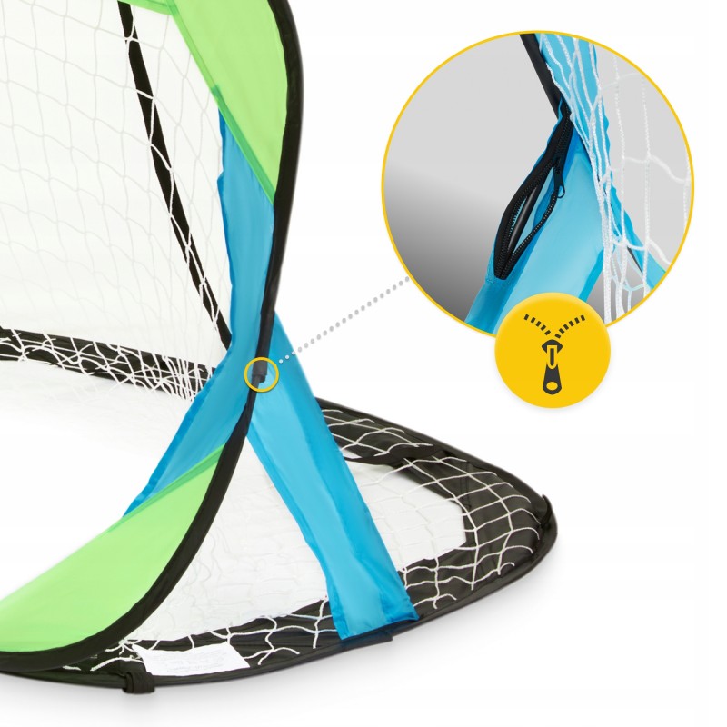 Футбольні ворота 4Fizjo Pop-Up виготовлені з комбінації матеріалів, що забезпечують високу надійність, стійкість до розтягувань і механічних пошкоджень. Конструкція побудована на еластичному каркасі з легкого, але водночас міцного скловолокна, що дозволяє витримувати активні удари м'ячем і зберігати форму. Розміри у розкладеному вигляді становлять приблизно 120 x 86 x 74 см, чого достатньо для динамічної дитячої гри, але при цьому ворота залишаються компактними і зручними в транспортуванні. У складеному вигляді вони займають лише 40 x 3 см, що дозволяє легко брати їх із собою в дорогу чи на прогулянку. Вага близько 1 кг, тому навіть дитина зможе допомогти з перенесенням. У комплект входить пара саморозкладних воріт, зручна сумка для зберігання і транспортування, чотири додаткові трубки для підсилення каркаса та вісім металевих кілочків для надійного закріплення на ґрунті. Це гарантує стабільність конструкції навіть під час інтенсивної гри.