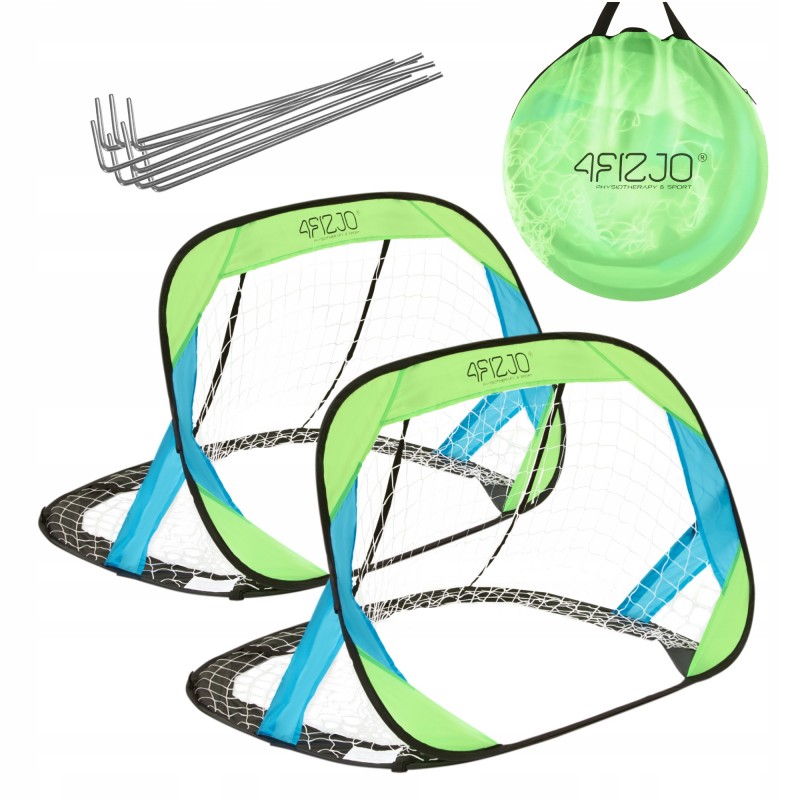 Футбольні ворота 4Fizjo Pop-Up виготовлені з комбінації матеріалів, що забезпечують високу надійність, стійкість до розтягувань і механічних пошкоджень. Конструкція побудована на еластичному каркасі з легкого, але водночас міцного скловолокна, що дозволяє витримувати активні удари м'ячем і зберігати форму. Розміри у розкладеному вигляді становлять приблизно 120 x 86 x 74 см, чого достатньо для динамічної дитячої гри, але при цьому ворота залишаються компактними і зручними в транспортуванні. У складеному вигляді вони займають лише 40 x 3 см, що дозволяє легко брати їх із собою в дорогу чи на прогулянку. Вага близько 1 кг, тому навіть дитина зможе допомогти з перенесенням. У комплект входить пара саморозкладних воріт, зручна сумка для зберігання і транспортування, чотири додаткові трубки для підсилення каркаса та вісім металевих кілочків для надійного закріплення на ґрунті. Це гарантує стабільність конструкції навіть під час інтенсивної гри.