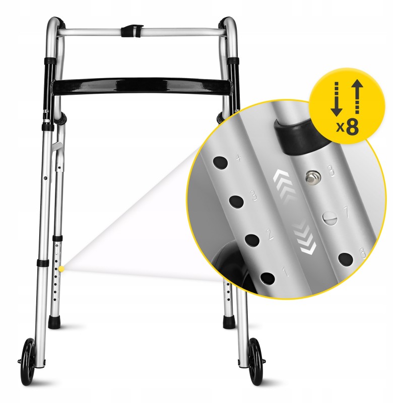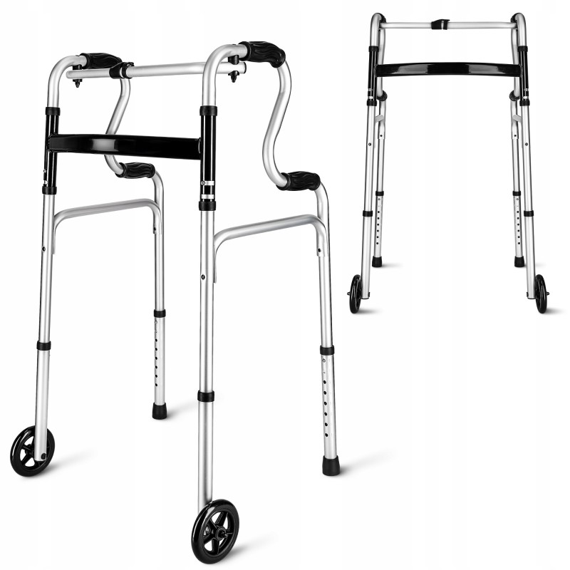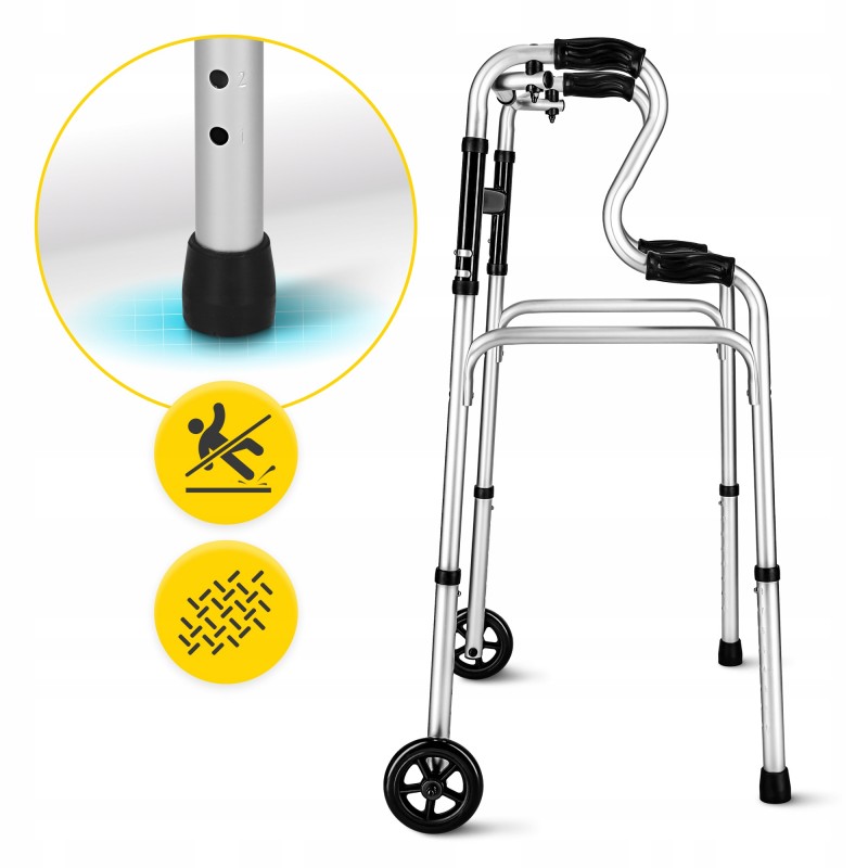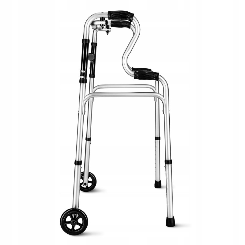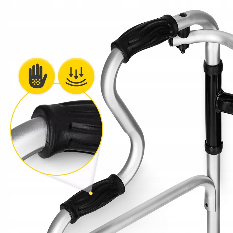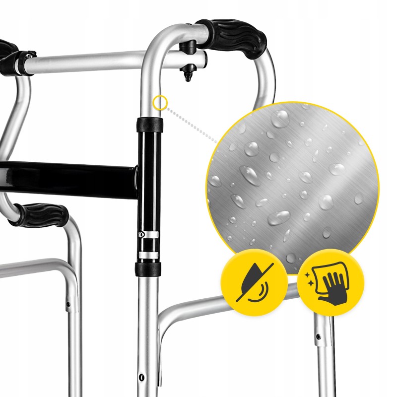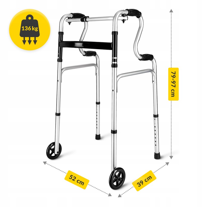 Ходунки 4Fizjo виготовлені з міцного алюмінію, який поєднує легкість та високу стійкість до пошкоджень і корозії. Вага конструкції складає лише 3 кг, тому користувач може без зусиль піднімати, пересувати та транспортувати виріб. Рама має складаний механізм, який активується натисканням однієї кнопки, що дозволяє компактно скласти пристрій навіть однією рукою та без зайвих зусиль. Регульована висота ручок у діапазоні від 79 до 97 см з кроком у 2.5 см дозволяє налаштувати ходунки під зріст конкретного користувача, забезпечуючи правильну поставу та комфорт під час пересування. Конструкція має ширину 52 см і глибину 39 см, що гарантує стійкість, але водночас дозволяє легко проходити через дверні отвори та коридори. Максимальне навантаження до 136 кг підтверджує надійність та безпечність виробу навіть для людей з більшою вагою. Ергономічні антиковзні ручки з м'яким покриттям забезпечують зручний хват у будь-якому положенні, а поєднання коліс та гумових насадок на ніжках дозволяє рухатися впевнено як у приміщенні, так і на твердих рівних поверхнях.