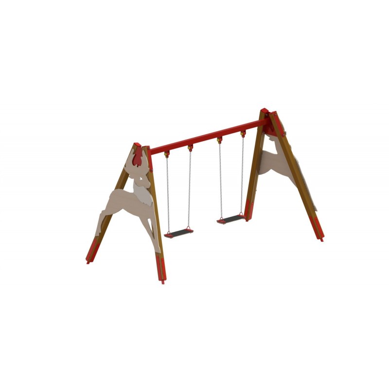 Гойдалка на дерев'яних стійках подвійна DIOS316 — це ідеальне рішення для створення веселого та безпечного ігрового простору для дітей. Його унікальний дизайн із дерев'яними стійками, прикрашеними декоративними вирізами у формі оленів, додає атмосфері казковості та гармонійно вписується у будь-який ландшафт. Дві гойдалки, підвішені на міцних ланцюгах до горизонтальної балки, забезпечують комфорт і безпеку під час гри.