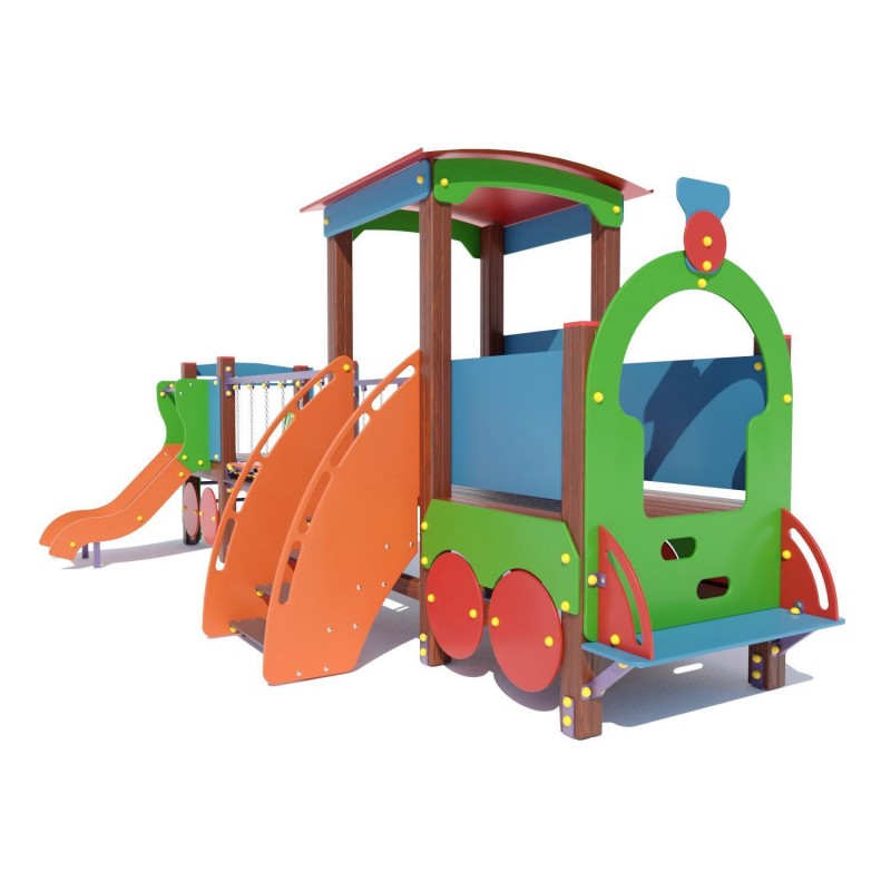 У комплекс входить дві кабіни з фанери (одна з дахом, друга без), які з’єднані сходами на металевих ланцюгах. Також у комплексі є маленький спуск. Для безпечного гальмування ділянка ковзання із вертикального переходить у горизонтальне. Кабіни встановлені кожна на 4-х дерев’яних балках, завдяки яким можна регулювати висоту підлоги в кабіні (встановити на дитячий майданчик або закопати ніжки в землю). У паровозик можна увійти трьома шляхами: звичайними дерев’яними сходами, сходами з металевих труб, або залізти сходами фанерного лаза. Вся конструкція виконана з дерева та вологостійкої фанери.