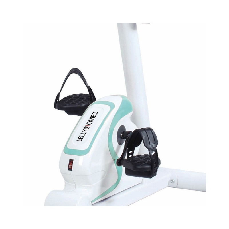 Мінівелотренажер WELLY-E Combi — електричний велотренажер для тренування рук і ніг, що дозволяє одночасно активізувати верхню та нижню частини тіла. Пристрій ідеально підходить для реабілітації, забезпечуючи плавний рух педалей зі швидкістю від 28 до 76 обертів на хвилину. Електропривід дозволяє обертати педалі вперед і назад без значних фізичних зусиль, сприяючи зміцненню м’язів і покращенню кровообігу. WELLY-E Combi оснащений 5 попередньо встановленими програмами та підтримує 12 рівнів швидкості, що дає змогу адаптувати тренування до індивідуальних потреб.