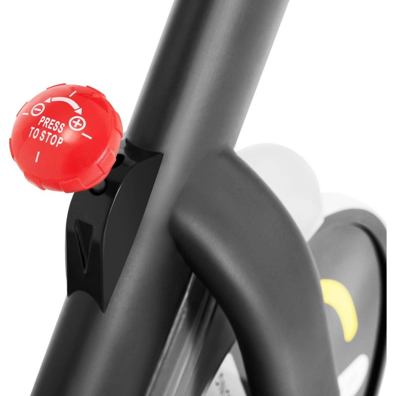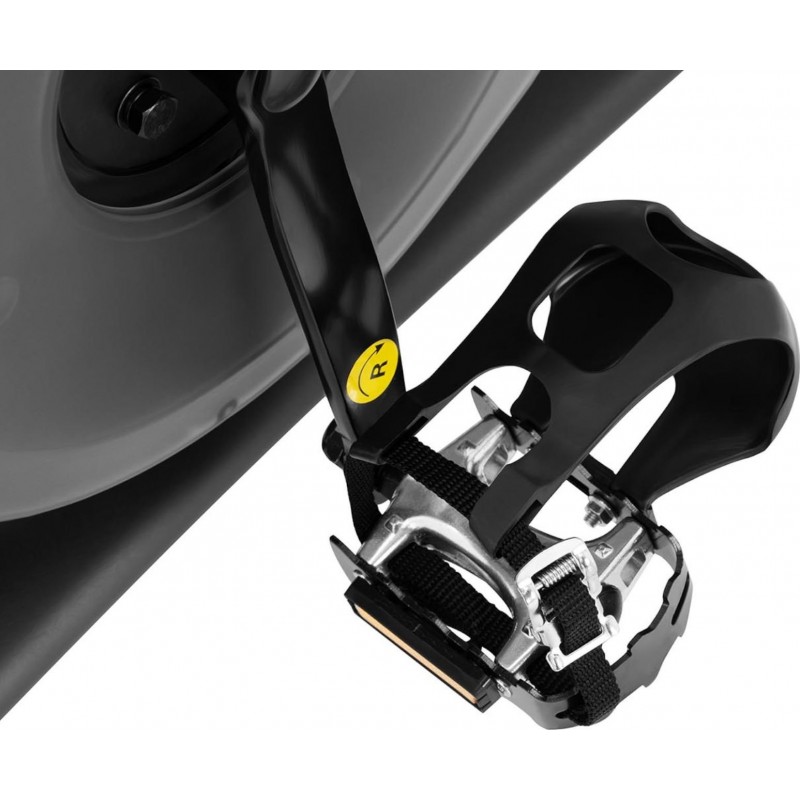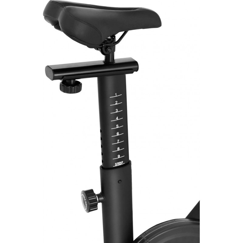 Велосипед легко підлаштувати під свій зріст. Регулюється висота керма (від 106 до 117 см на 9 рівнях), висота сидіння (від 83 до 100 см на 10 рівнях) і горизонтальне положення сідла (від 40 до 58 см). Зручне сидіння дозволяє проводити тривалі тренування. Збалансовані педалі з ременями для ніг і маховик масою 13 кг забезпечують плавне та приємне обертання коліс. Домашній велотренажер також має ремінний привід, яким легше та довговічніше керувати та регулювати, ніж велосипедний ланцюг. Великий РК-екран дозволяє зчитувати час тренування, швидкість, пройдену відстань або спалені калорії. Велосипед також має тримач для смартфона або планшета.
