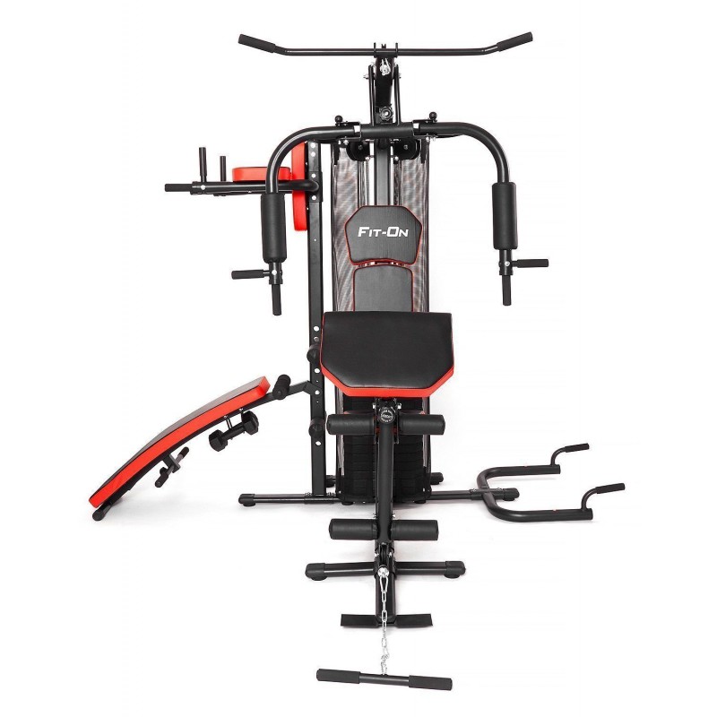 З трьома позиціями фітнес станція Fit-On G3 дозволяє проводити паралельні тренування кільком людям. Верхня та нижня тяга гарантують ефективне тренування м'язів рук, спини та плечей. Парта скота з регулюванням по висоті дозволяє інтенсивно тренувати біцепс. Батерфляй та тренувальні поручні (бруси) зміцнюють м'язи грудей. Похила лава для преса із двома гантелями вагою 1,5 кг, оснащена можливістю регулювання по висоті. Додатково станція оснащена опорами для віджимань.