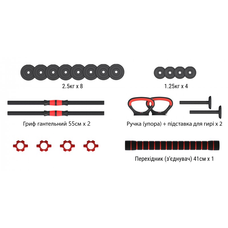 - Штанга: з’єднувальний стрижень дозволяє зібрати повноцінну штангу.