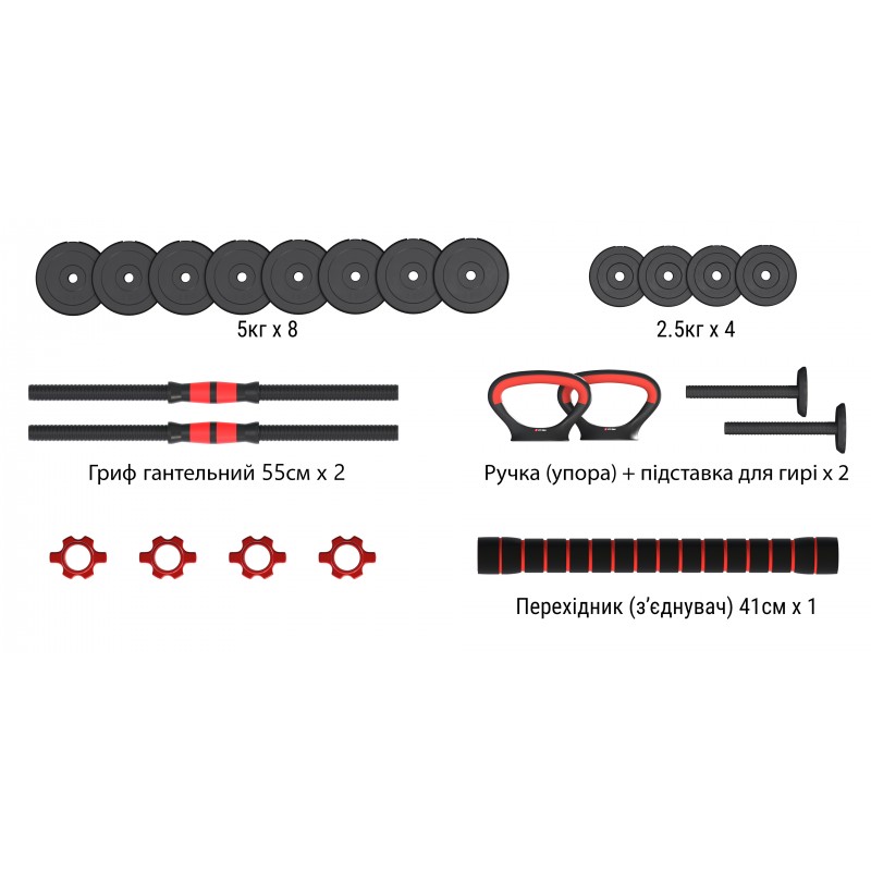 - Штанга: з’єднувальний стрижень дозволяє зібрати повноцінну штангу.